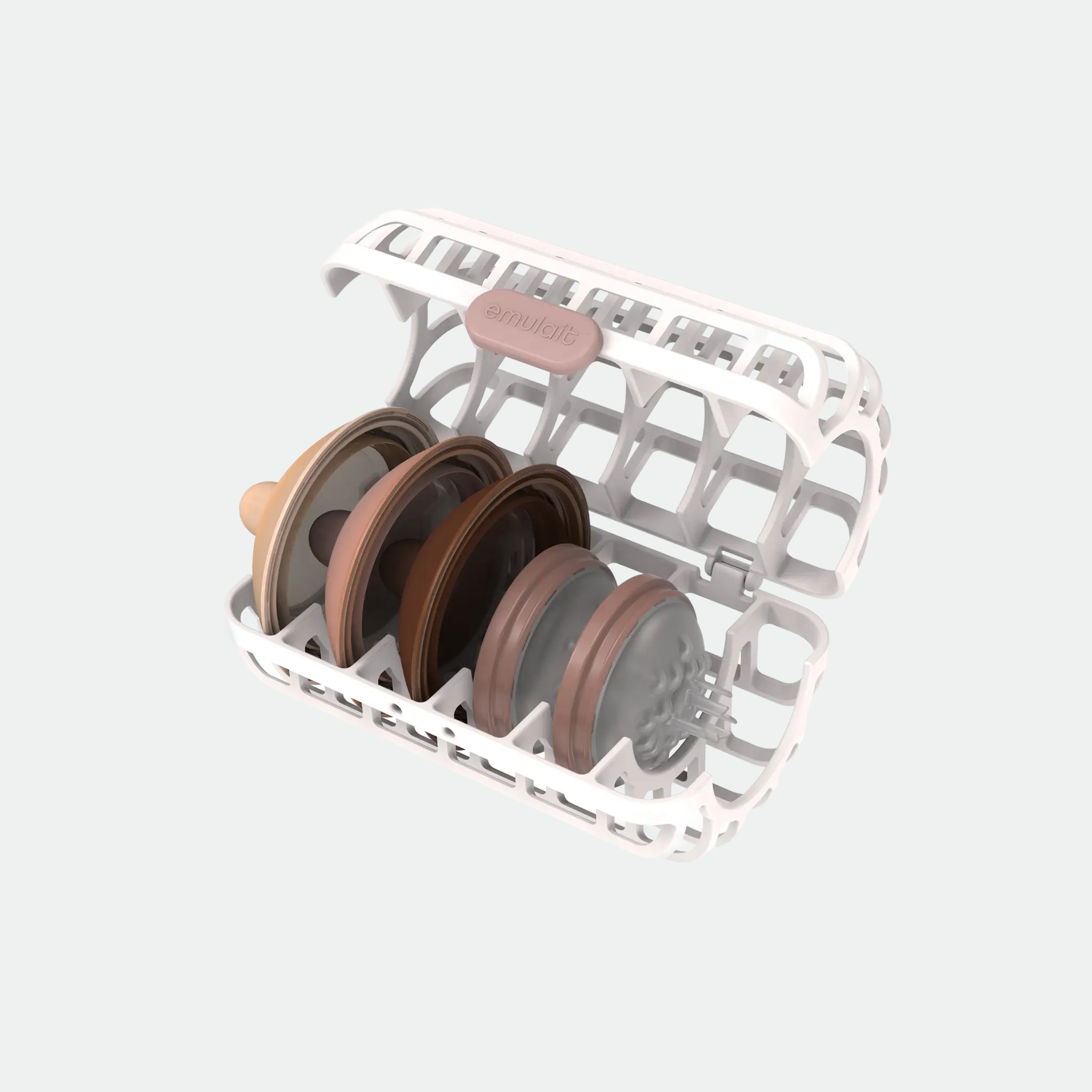 The Dishwasher Basket can hold Emulait nipples (6), pacifiers, responsive flow valves and breast pump adapters.